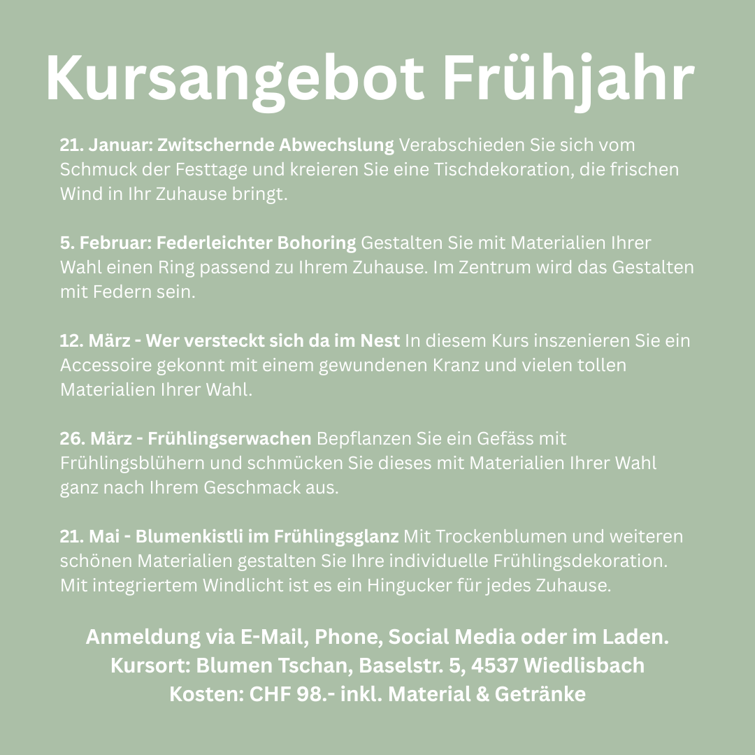 Wir freuen uns auf viele tolle Kursabende mit Ihnen. Kreieren Sie wunderschöne Werkstücke und geniessen Sie einen entspannten Abend. Sie werden von unserem erfahrenen Floristik-Team angeleitet. Die Kurse starten jeweils um 18.00 Uhr.